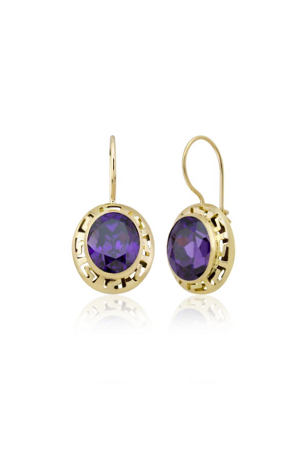 Zirkon taşının cezbedici mor rengi, Grek antik su deseni ile birleştiğinde ortaya muhteşem bir tasarım çıkıyor. Yüzük, küpe ve kolyeden oluşan bu altın set, mücevherleriniz arasında özel bir yer alacak.