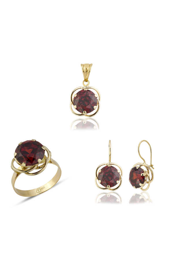 Zirkon taşının göz alıcı garnet taşı kırmızı rengi, altın olimpiyat deseni işlemesi ile şık bir tasarıma bürünüyor. Kusursuz berrak görünümlü Altın Olimpiyat Garnet (Kırmızı) Renk Üçlü Set, kaliteden ödün vermeyenlerin ilk tercihi olacak.